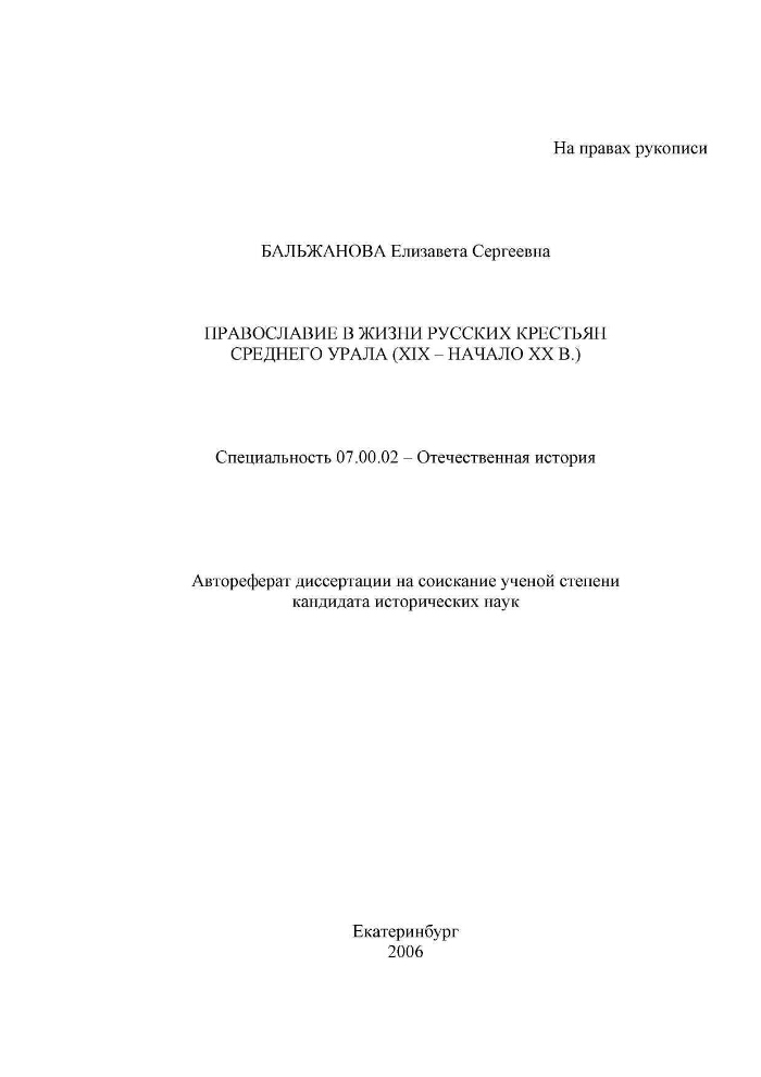 Православие в жизни русских крестьян Среднего Урала (XIX - начало XX в.)